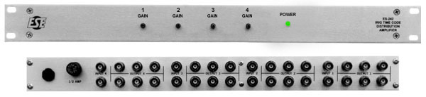 The ES-242 is a Quad 1 x 6 IRIG Time Code Distribution Amplifier for modulated AM Time Codes. It is housed in a 1.75” x 19” rackmount panel and chassis (the chassis extends 4.8” behind the panel). Each amplifier provides a loop-thru input and six 600 ohm outputs. The inputs and outputs are connected via the rear mounted BNC connectors. The ES-242 can distribute IRIG A, B, E, NASA36, XR3, 2137 and CS3 time codes.