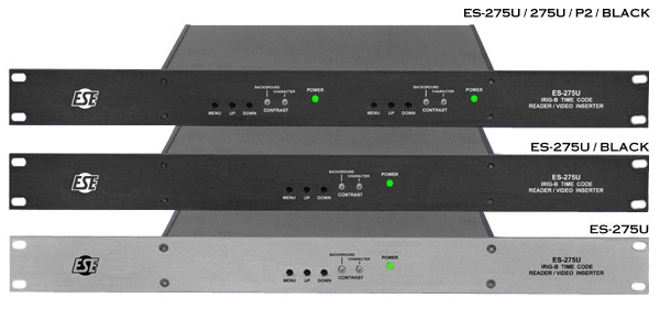 The ES-275U is a Video Character Inserter unit which receives an external source of IRIG-B timecode. 12 digits of time data (Day of Year, Hours, Minutes, Seconds and Milliseconds) are superimposed onto a video signal looped-thru the unit. On-screen menus allow time setting, adjustment of the display Size, Position and Mask Mode (black background on/off and transparent or solid display) and Milliseconds on/off. The brightness of the Characters and Background may be individually set via front-panel controls. The display may be turned on/off via a front-panel control. An optional RS-232 interface & Windows® Control Panel software may be ordered, which allow remote control of the display modes.