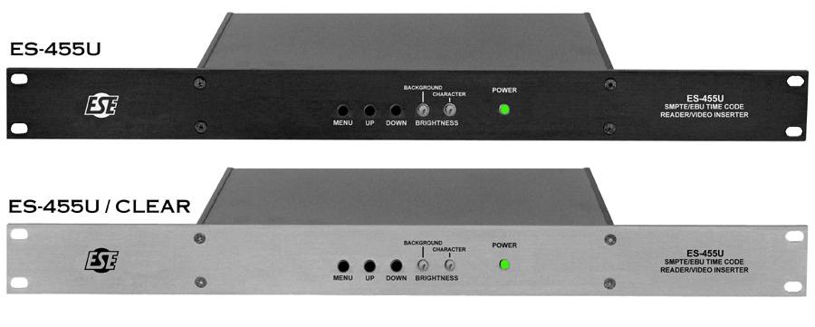 The ES-455U is a Video Character Inserter unit which receives an external source of SMPTE/EBU timecode. 8 digits of Time data (Hours, Minutes, Seconds and Frames) and 8 User Bit digits are superimposed onto a video signal looped-thru the unit. On-screen menus allow adjustment of the display Size, Position and Mask Mode (black background on/off and transparent or solid display). The display mode may be changed to display the Time and User bits either Side-by-Side or Stacked, or to display Time or User Bits only. The brightness of the Characters and Background may be individually set via front-panel controls. The display may be turned on/off via a front-panel control. An optional RS-232 interface & Windows® Control Panel software may be ordered, which allow remote control of the display modes. The unit will read bi-directionally from 1/30 to 30x play speed (dependent upon the audio/timecode performance of the video player).