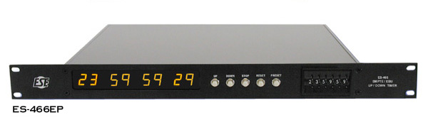 The ES-466E is an eight digit, presettable 24 hour SMPTE Up/Down Timer (00:00:00:00 - 23:59:59:29) with five front panel mounted controls (UP, DOWN, STOP, RESET and PRESET) and an eight digit display. All displays are 0.56" amber LED digits. A SMPTE output is provided on the rear panel XLR connector. The "Bit Order Forward" toggle switch on the rear panel allows the unit to mimic decks that always output "forward" bit order code. EBU Time code is optional.