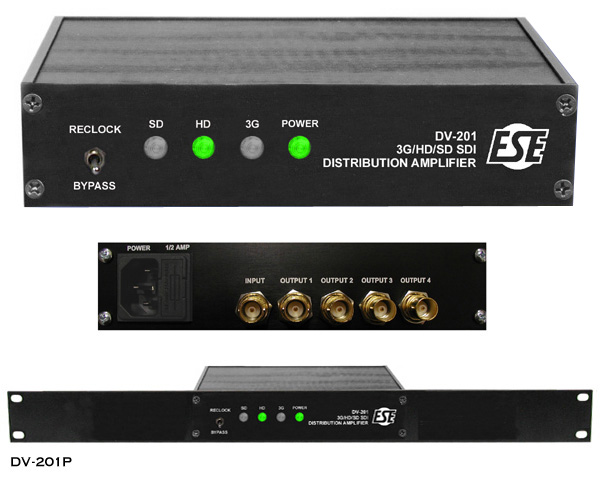 The DV-201 is an SDI digital video (3G, HD & SD) 1 x 4 Distribution Amplifier. The unit features high-performance & low-cost and is able to distribute 3Gb/s, 1.5Gb/s & 270Mb/s data rates. The DV-201 automatically detects the data rate and then re-clocks and equalizes the signal. The Distribution Amplifier can equalize 400m @ 270Mb/s, 200m @ 1.5Gb/s and 140m @ 3Gb/s of 1694A coax cable. An external power supply is not required as the DV-201 is completely self-contained requiring only 117VAC or 220VAC (option J) to operate. The small desktop enclosure can be easily placed behind an equipment rack or in the rack by specifying the rack mount option.