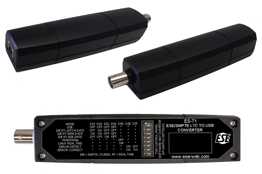 The ES-71 converts SMPTE/EBU LTC code or ESE Time Code to a USB interface. The device is powered by the USB interface and is intended for computer time synchronization. The unit features four modes of operation, which may be selected by DIP switch or by software: ESE Time Code, or LTC Real Time with 3 selectable date formats (Leitch, SMPTE 309M or ESE).